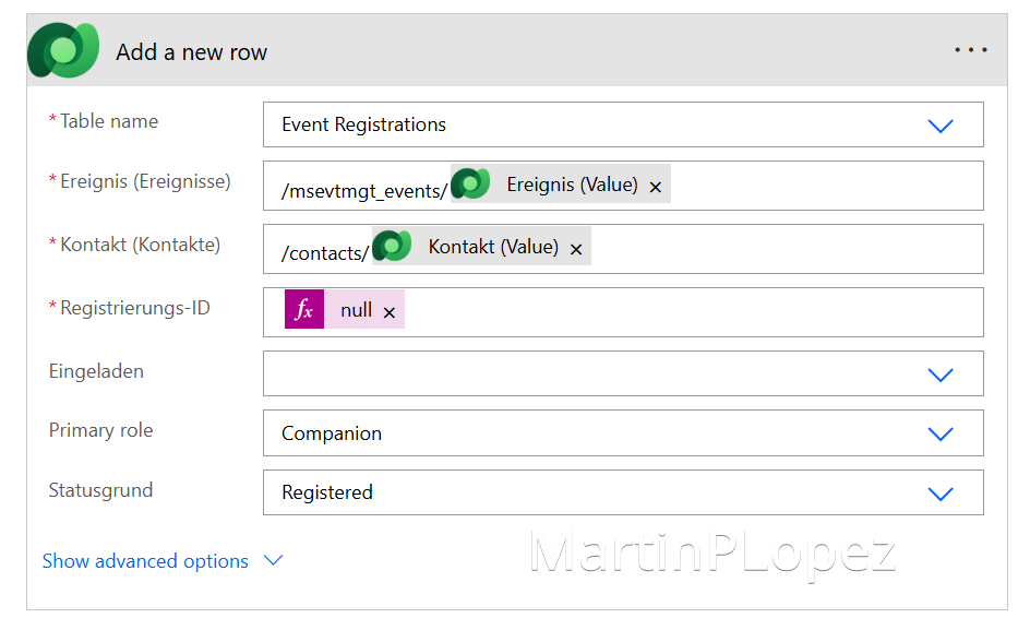 We’ll Update a Row with of the entity Event Registrations. With this action, we’ll update the current registration to give the role of the Attendee. In the Row ID, make sure to choose the Event Registration from the trigger a.k.a @{triggerOutputs()?['body/msevtmgt_eventregistrationid']}