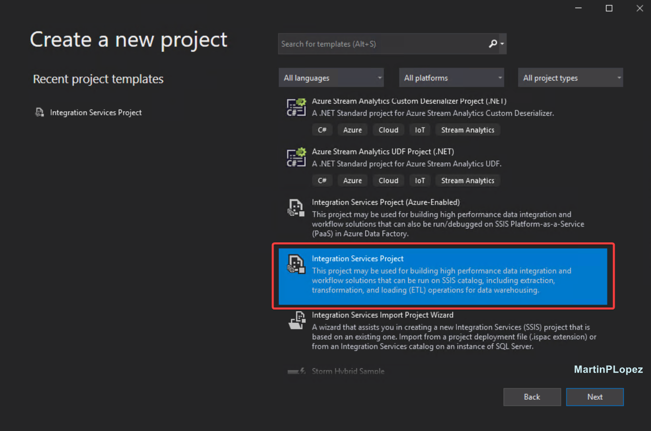 Open Visual Studio and create a new project: Integration Services Project.