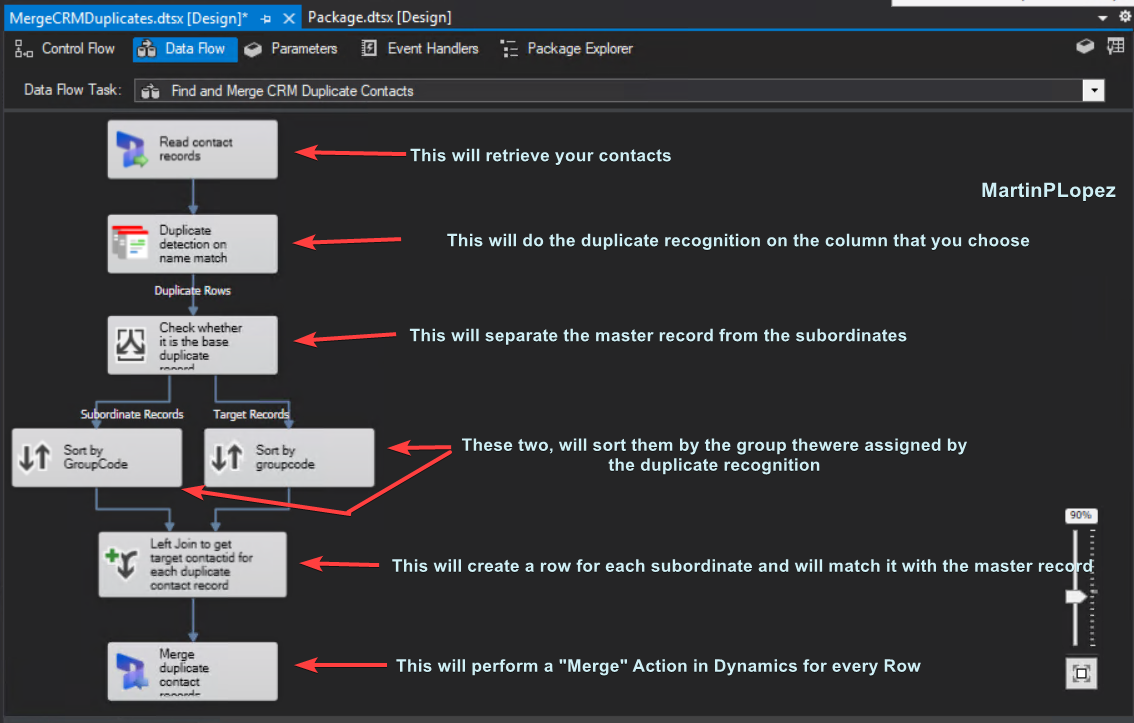 Next, open the MergeCRMDuplicates.dtsx package, and double-click the Find and Merge CRM Duplicate Contacts task in the Control Flow. You’ll land right in the command center: