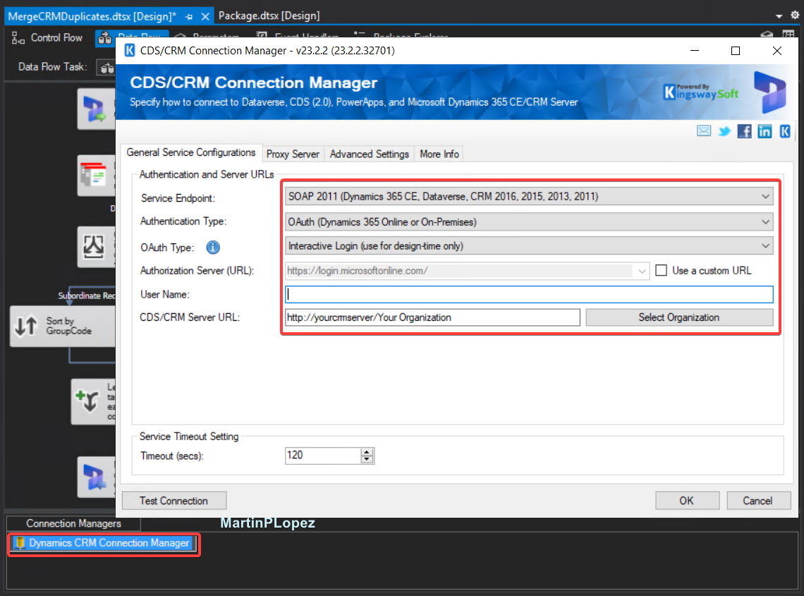 Connection tip: Even though to use the Dynamics 365/Dataverse Connection Manager with OAuth (Web API) seems more appealing than SOAP. In my experience the SOAP connection technology is more developed than the Web API with Kingswaysoft. I had cases in which the logics built in SSIS were working perfectly with SOAP but not with WebAPI. For reference: Using the CRM/Dataverse/CDS Connection Manager