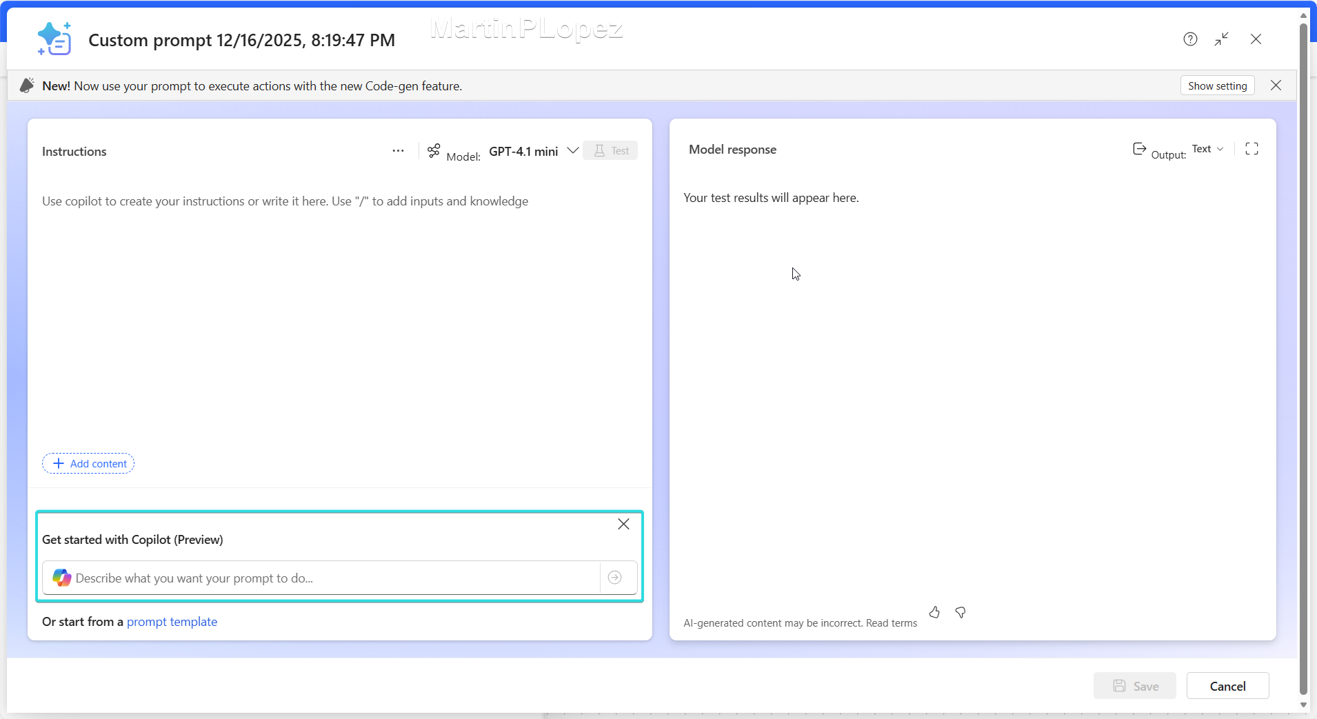 We’ll create a new prompt from scratch, so click on “+ New custom prompt”, this will open a window like the following:
